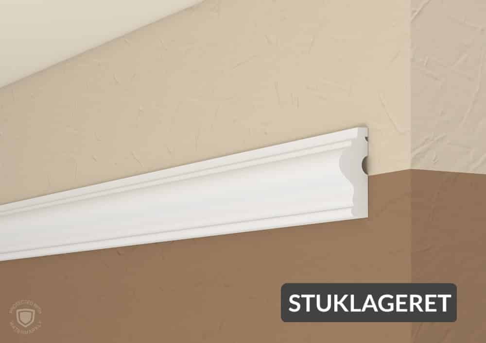 Stuklisten er i slagfast hårdt materiale og nem at arbejde med. Mål listen op og skær stuklisten til i skærekasse.