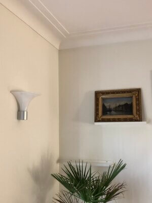 Er stuklisterne eller rosetten ikke malet på forhånd, kan det med fordel gøres, før du du sætter dem op.